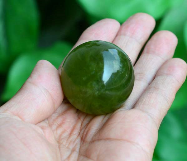 These spheres vary slightly in size, weight, and color tone, ranging from pale yellowish green to deep olive green. Some pieces show a soft cloudy texture, while others appear more uniform and glassy. The variation is natural and part of the stone’s character.