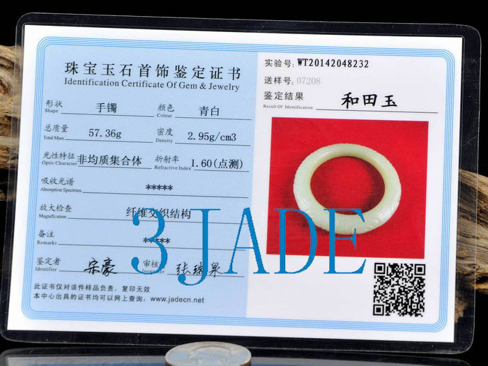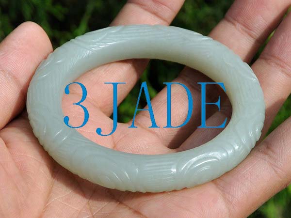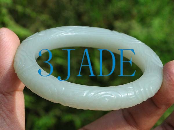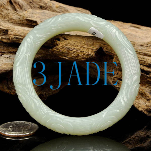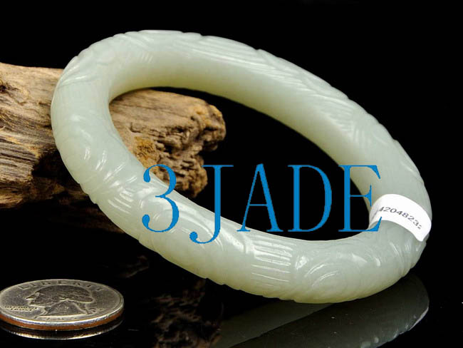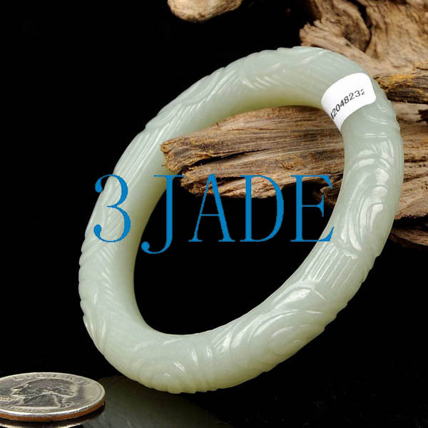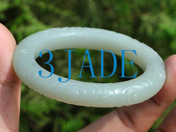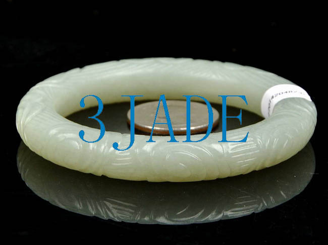 • This 54.5mm small size bangle is made out of solid natural white nephrite jade, Chinese traditional brocade patterns are hand carved around the surface, great design and workmanship, with no scratches, flaws, or repairs, perfect condition, comes with the jade certificate of authenticity.
