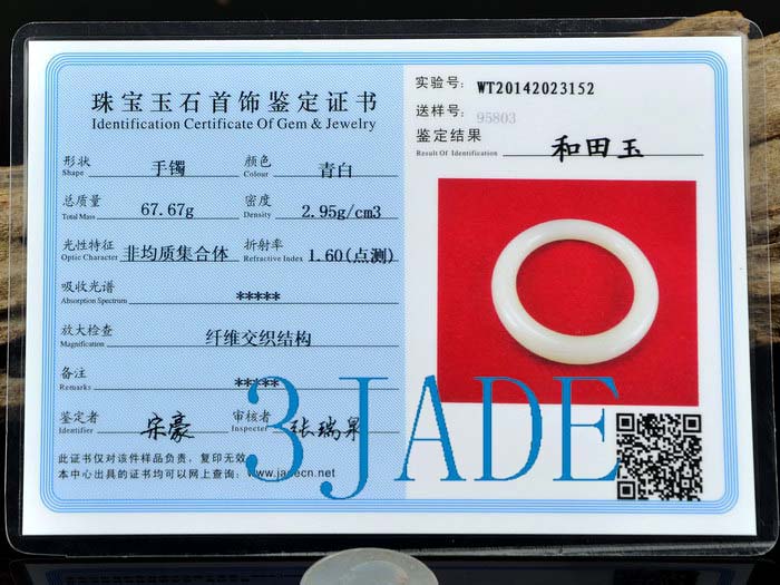 Material Natural Hetian Nephrite JadeSize Inside diameter: 58.7mm, height (diameter of the section): 11.5mm