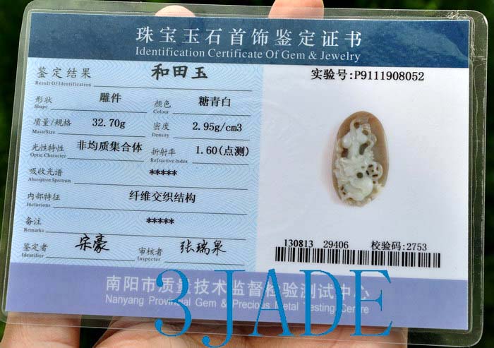Description: Natural Hetian nephrite jade, great handwork, comes along with certificate, as shown in the pictures.
