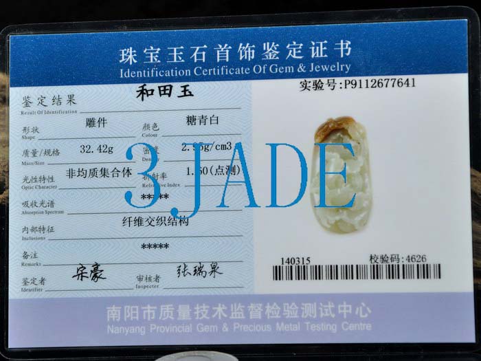 Description Natural Hetian nephrite jade, natural color, great handwork, come along with certificate, as shown in the pictures.