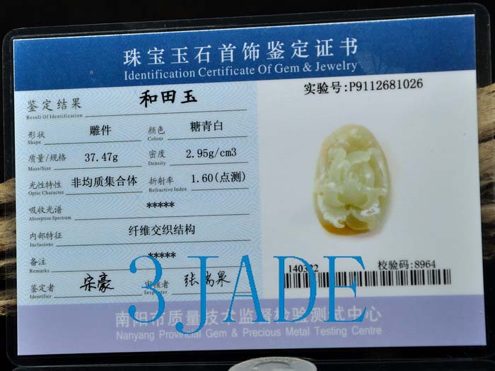 Description Natural Hetian nephrite jade, natural color, great handwork, come along with certificate, as shown in the pictures.