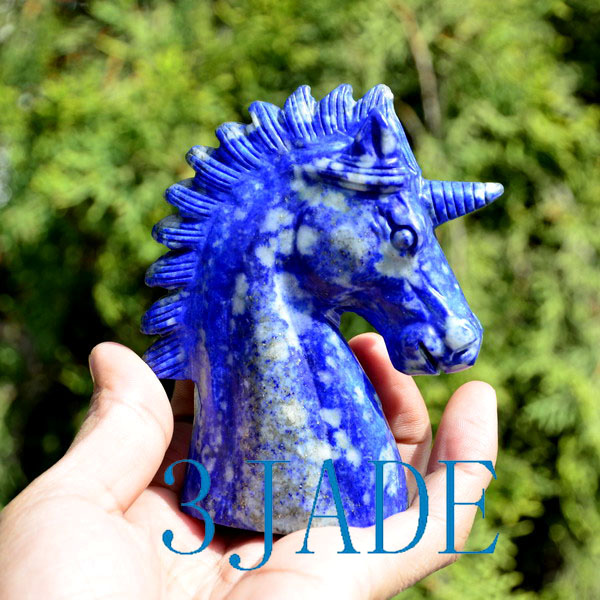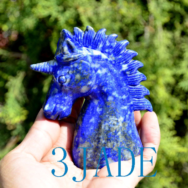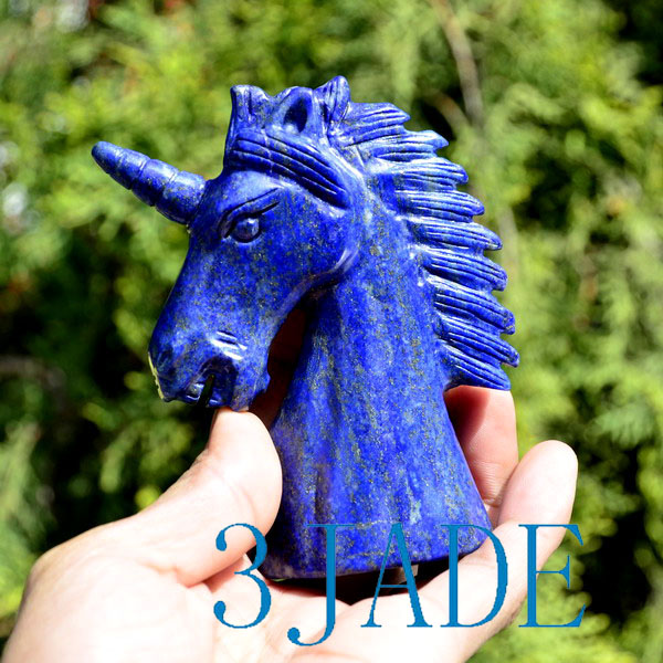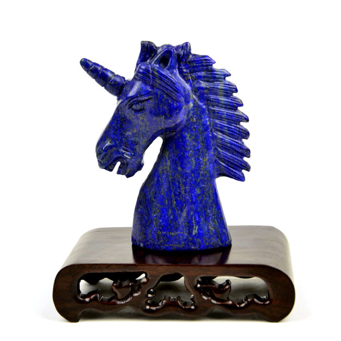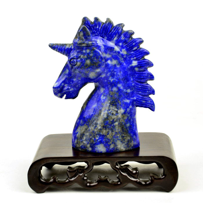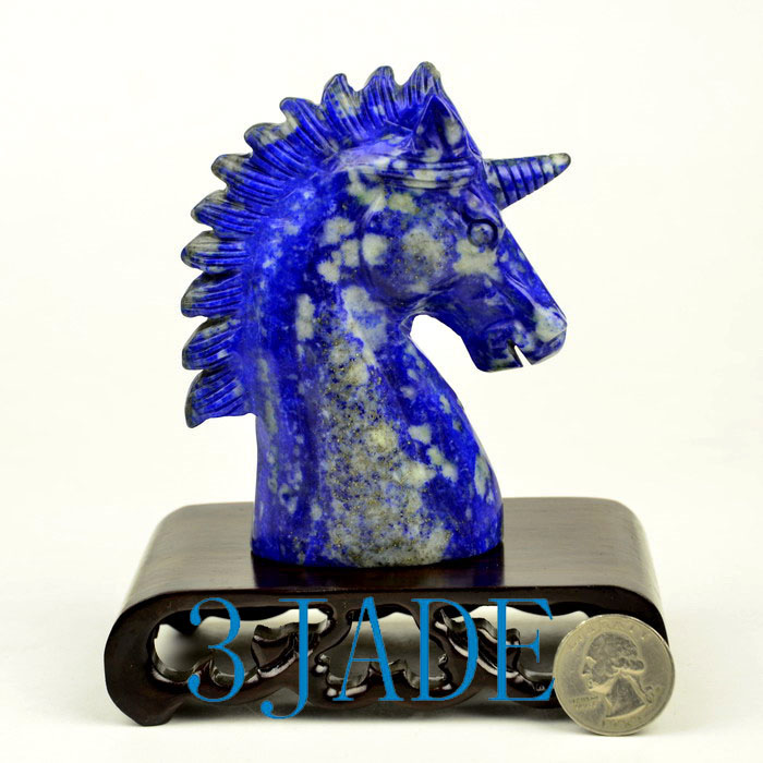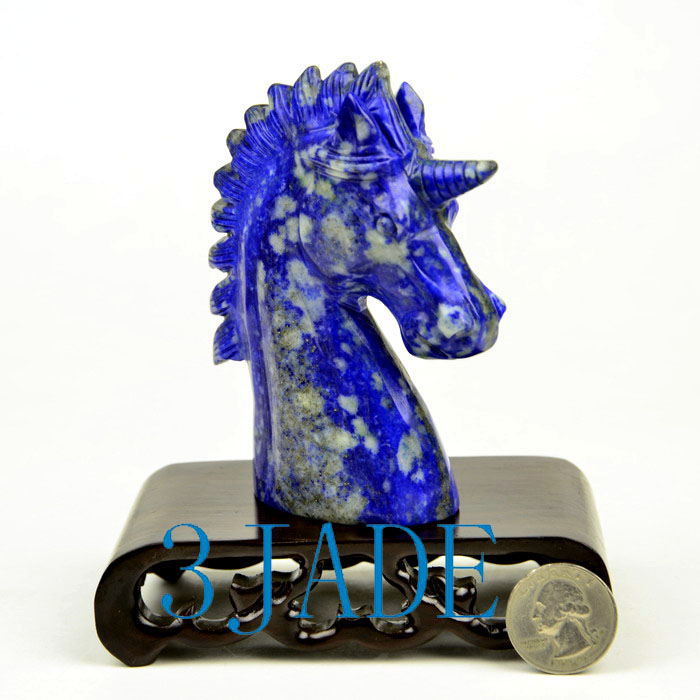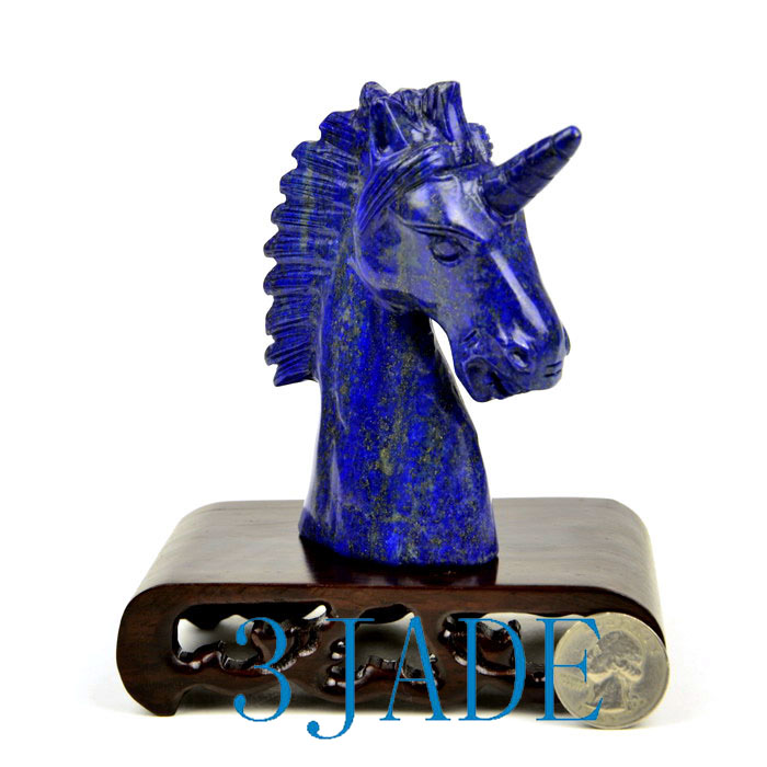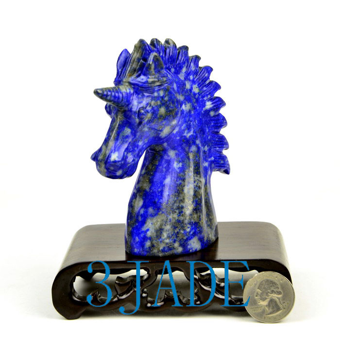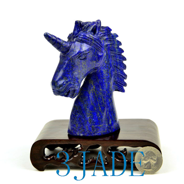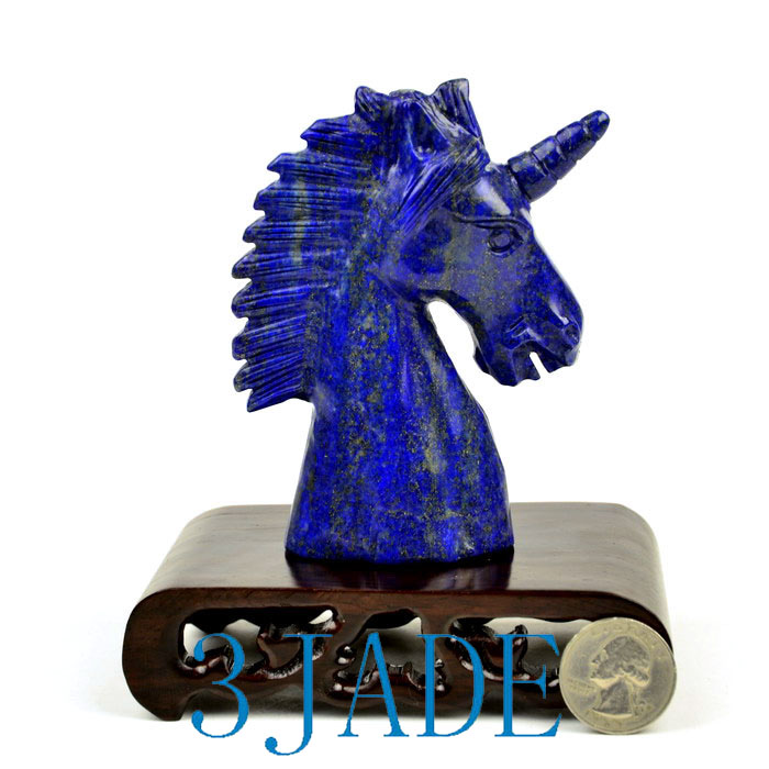 • The hand carved natural Lapis Lazuli unicorn statue stands 4 inches high. It is natural Lapis Lazuli gemstone, natural blue color, great handwork, comes with the wood stand.