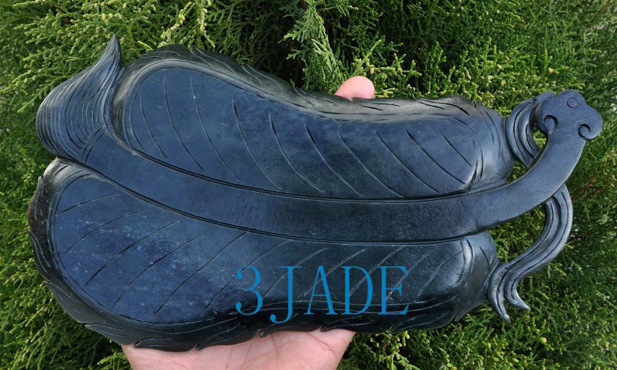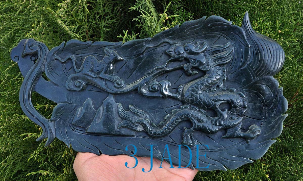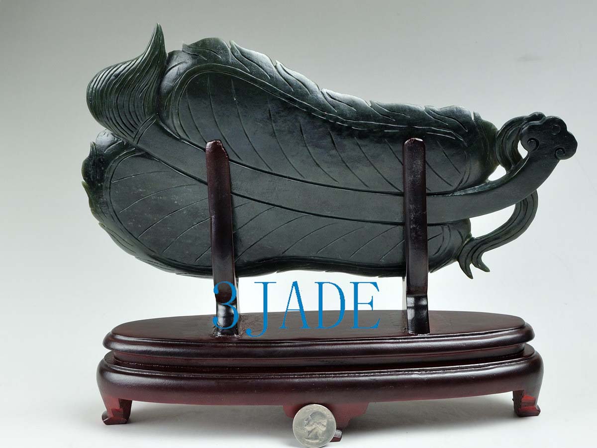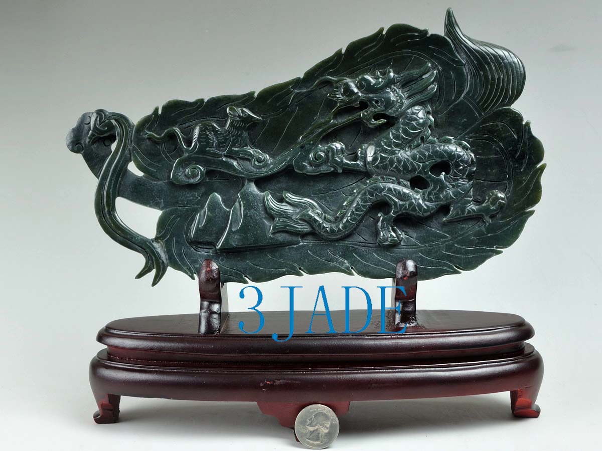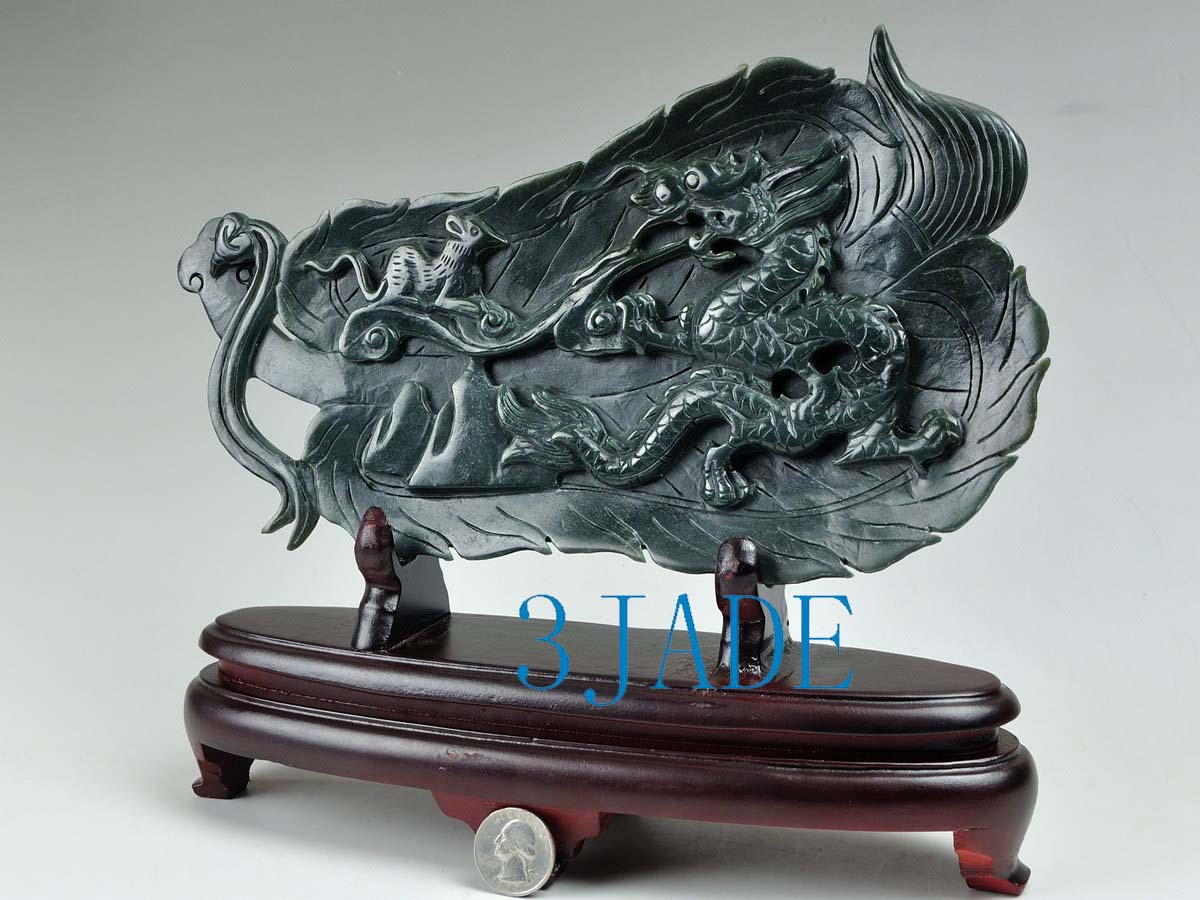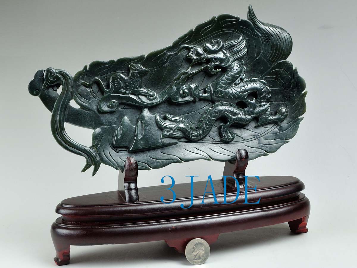 This Chinese traditional Dragon Fan Statue is hand carved out of one solid piece of nephrite jade. It is natural jade, natural color, great workmanship.
