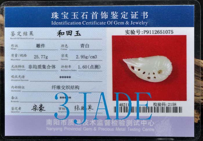 Description Natural Hetian nephrite jade, great handwork, comes along with certificate, as shown in the pictures.