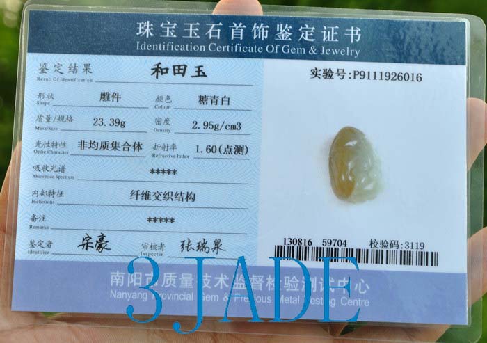 Description: Natural Hetian nephrite jade, great handwork, comes along with certificate, as shown in the pictures.
