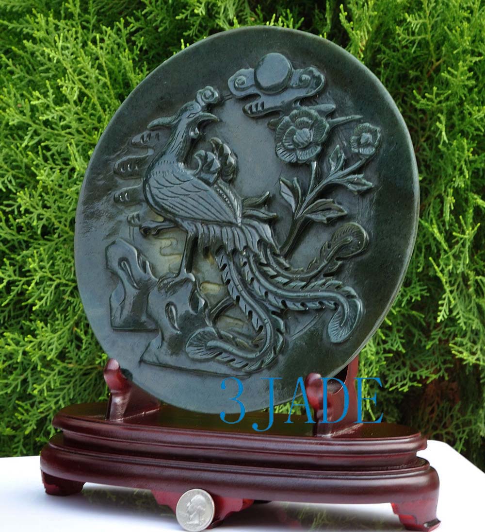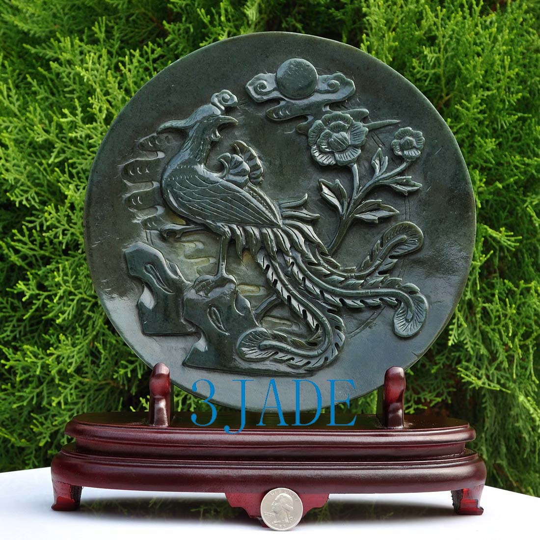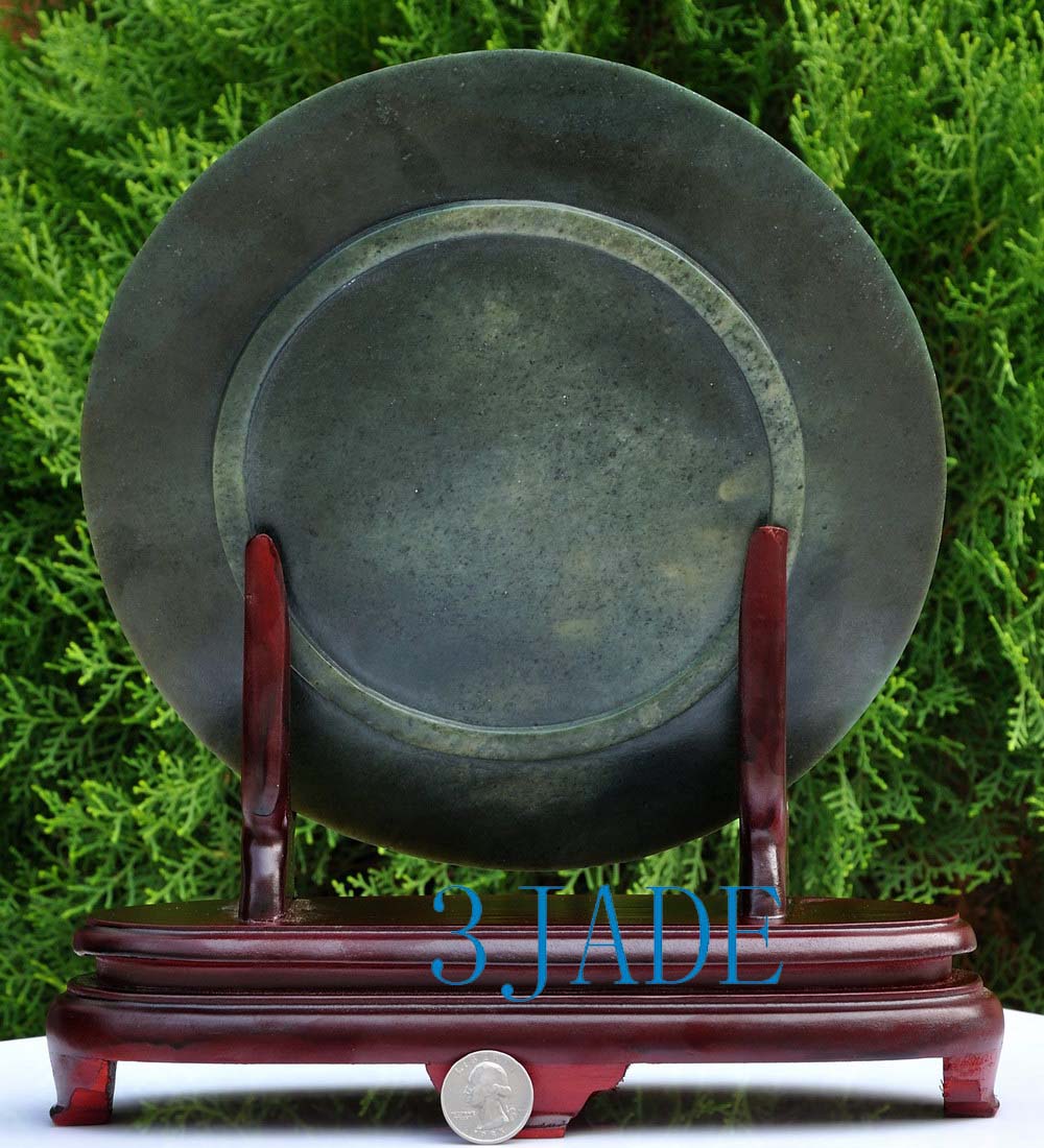 Material: Natural nehprite jadeSize: Carving: 9 1/8"(diamater) * 1/4"(thickness), stand: 10" * 6"(height) * 3 1/2"