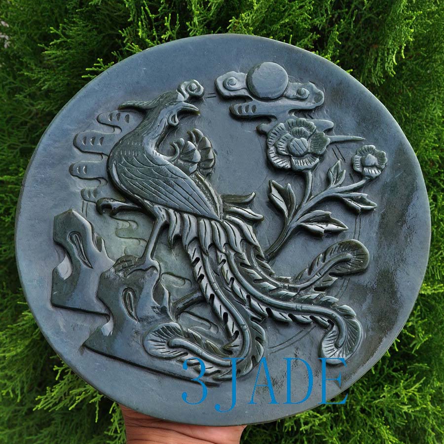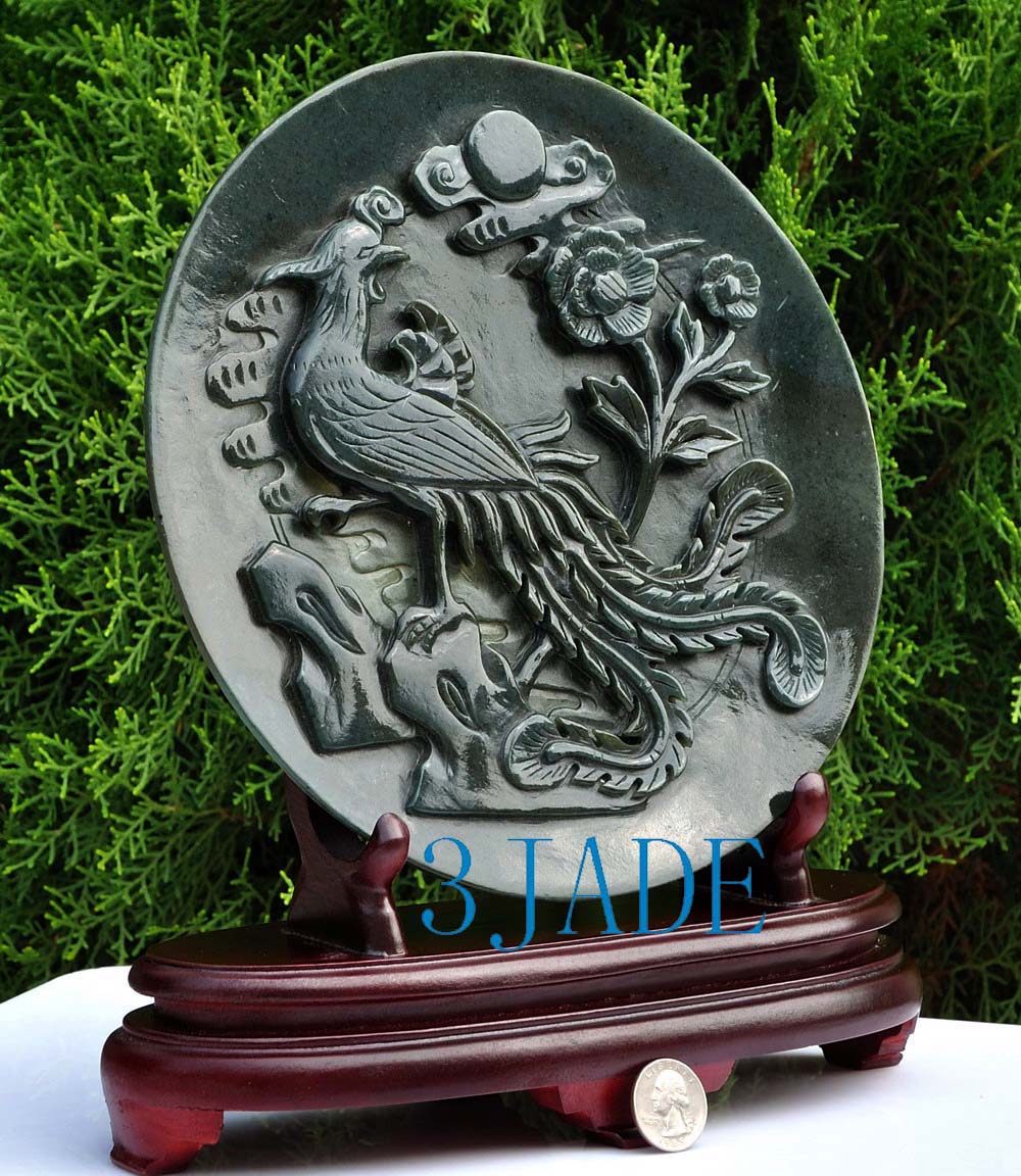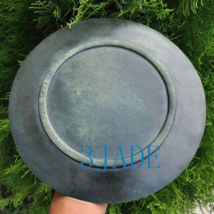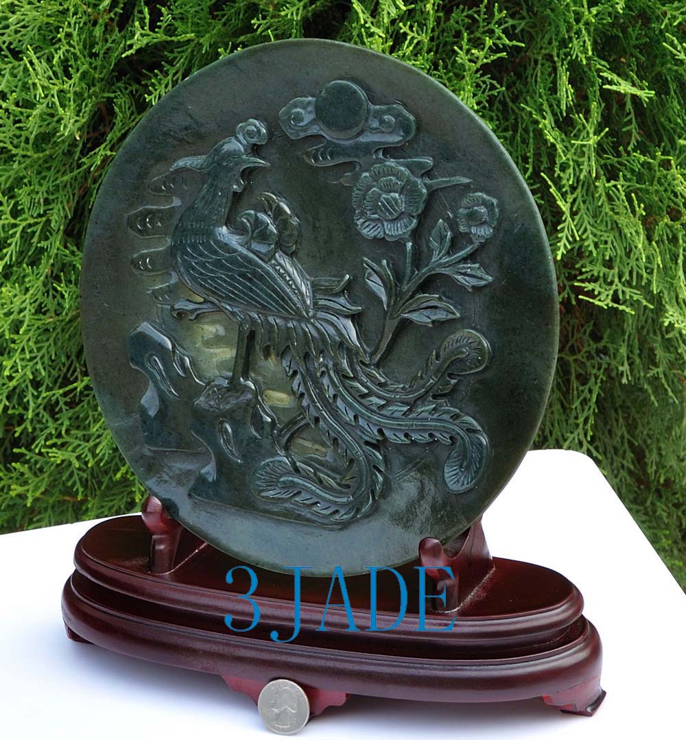 Material: Natural nehprite jadeSize: Carving: 9 1/8"(diamater) * 1/4"(thickness), stand: 10" * 6"(height) * 3 1/2"